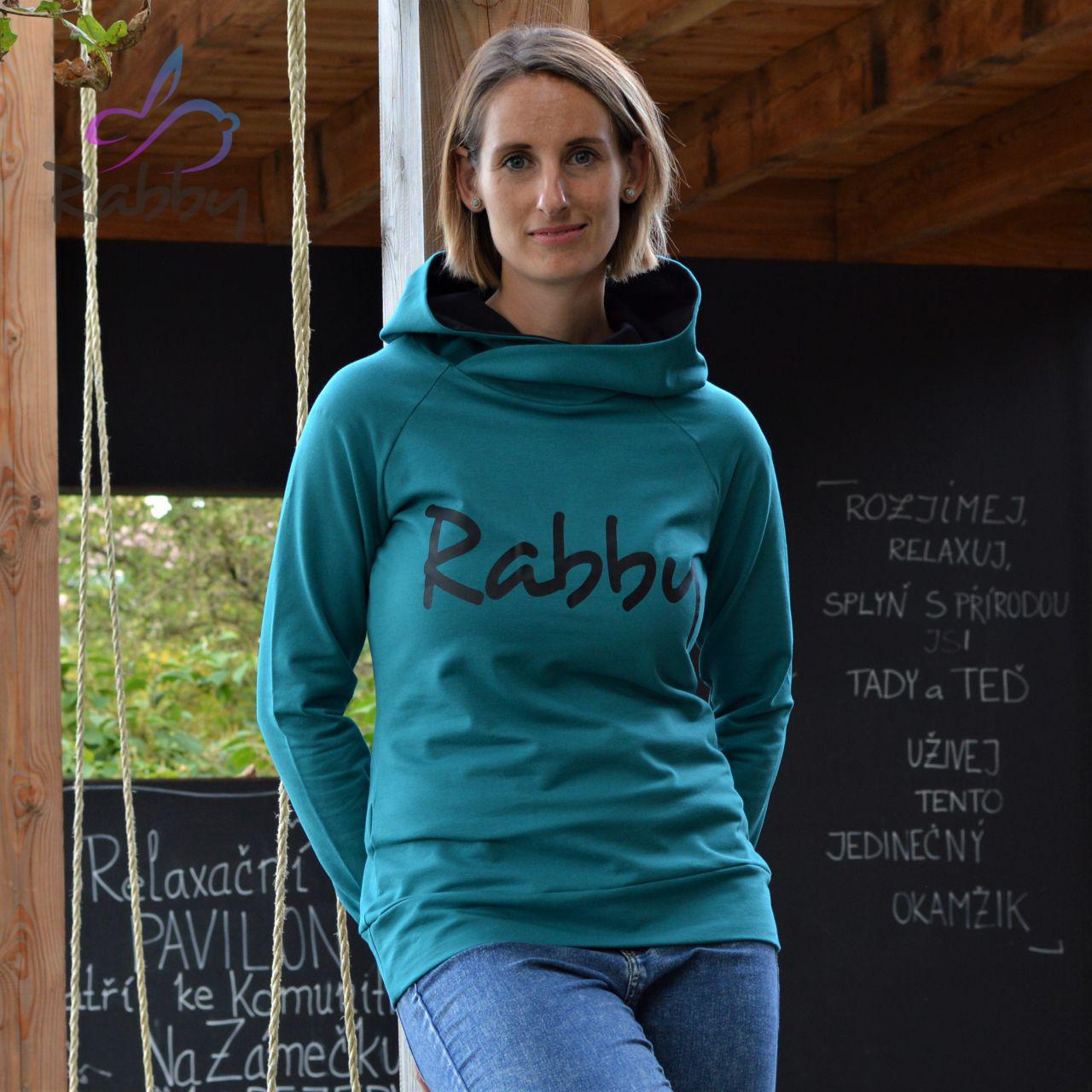 Informace o zboží Dámská mikina s bohatou kapucí petrolej s nápisem Rabby vel. 36