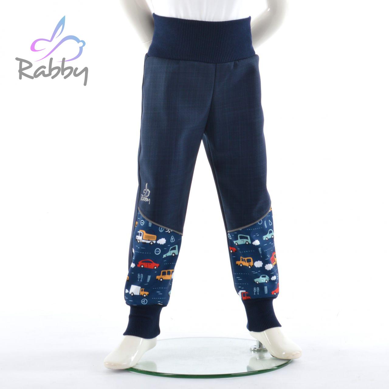 Jarní softshellové kalhoty modré s přestřižením auta na modré - klasický střih vel. 146